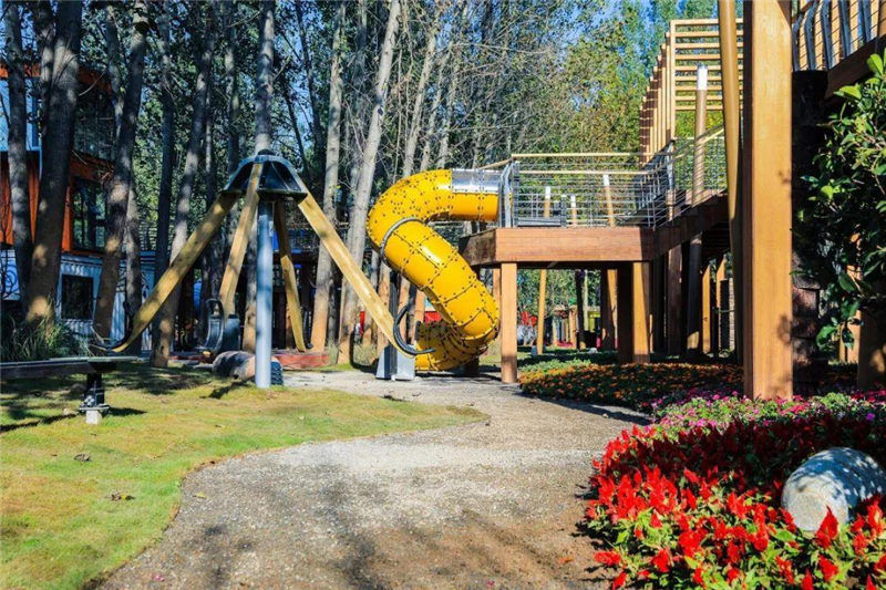 通過遊樂設備串聯起一個豐富多彩的趣味運動空間及康樂運動空間,形成一個親子互娛的空間典範,小孩子可以在大人的照看下盡情玩樂,徜徉在自然生態的環境中。靈動曲線的地形使得功能與形式出色結合,攀爬網、攀援繩、蹦網、鑽洞豐富孩子們的遊玩體驗。